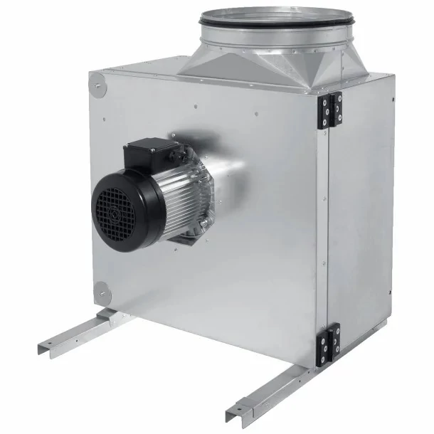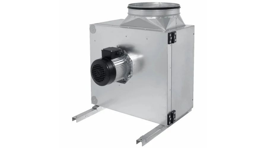 Egyoldalról szívó centrifugális nagykonyhai, kibillenthető járókerekes ventilátor. A panel horganyzott acéllemezből készül, a DIN EN 13501-1 szabvány szerinti A1 építőanyag-osztályú, nem éghető, 40 mm-es ásványgyapot szigeteléssel. A készülékre szerelt szerelősínek gumi rezgéscsillapítókkal ellátottak, és áthelyezhetők a panelre, így háromféle csatlakozási irányt tesz lehetővé. A kör keresztmetszetű légoldali csatlakozó csonkok szabványos méretekkel és dupla ajakos tömítésekkel rendelkeznek a légmentes csatlakozás érdekében. Beépítésre került egy zsír/kondenzvíz gyűjtőtálca, amely csak akkor használható, ha kifúvó csonk függőlegesen felfelé irányban kerül elhelyezésre. A kondenzvíz csatlakozó a készülék alsó panelje alatt található. A kifordítható ventilátorkerék a tisztítási és karbantartási munkákhoz hozzáférési ajtóként is szolgál, nyitott helyzetben zárható.A hátrafelé hajló, erős járókerék egy feszültségszabályozható IEC szabványos motor tengelyre szerelt. A golyóscsapágyak karbantartásmentesek és élettartam-olajozottak, mindkét oldalon tömítettek. Fordulatszám szabályzás transzformátoros fokozatkapcsolóval vagy frekvenciaváltókkal (3-fázis esetén) lehetséges. A motor a légáramlaton kívül helyezkedik el, így optimálisan védett a szennyeződésektől. A motor alapfelszereltségként beépített termokontakttal (a csatlakozódobozban bekötve) a túlmelegedés elleni védelem érdekében.