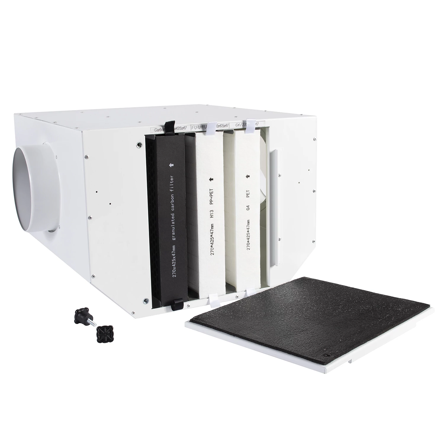 A szűrő-boxba legfeljebb 3 különböző szűrő helyezhető be - porszűrő (G4), HEPA szűrő (H13) és szénszűrő. A dobozban lévő szűrők sorrendje a levegő áramlásának irányától függ, amelyet egy nyíl jelez a szűrő fedelén. A burkolatra szervizpanel van telepítve, amely lehetővé teszi a szűrők gyors hozzáférést a szűrő-box bármely pozíciójában. A levegő áramlásának irányában a szűrőket a következőképpen kell telepíteni: az első az úgynevezett előszűrő, amely egy G4 porszűrő, a sorban következő, azaz a második szűrő egy HEPA szűrő H13, amely a 2,5 mikron átmérőjű szilárd részecskék akár 99 %-át képes felfogni. A harmadik pedig egy szénszűrő, amely eltávolítja a nemkívánatos szagokat és gázokat.